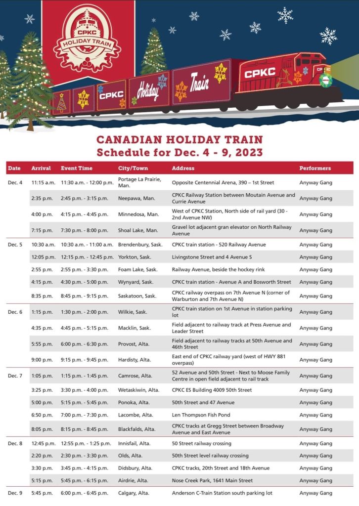 The CPKC Holiday train will be making it’s way through the area. It’s going to be beautiful outside so check it out. They always have excellent entertainment to check out. It will make its way down the line towards Saskatoon today, There is a schedule below.