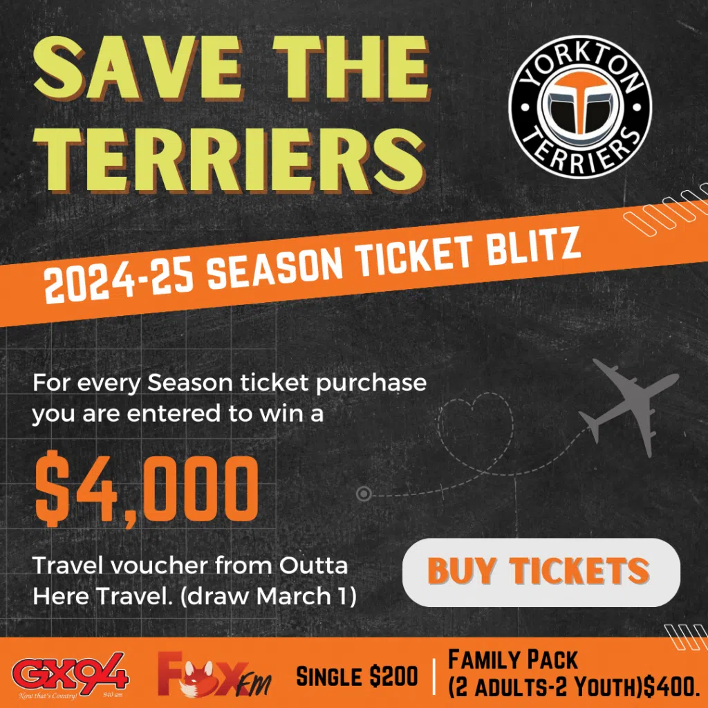That’s right! If you get your season tickets for the Yorkton Terriers 2024-25 season before the end of February, you are entered in for a $4,000.00 travel voucher from Outta Here Travel! That’s a no brainer right!
