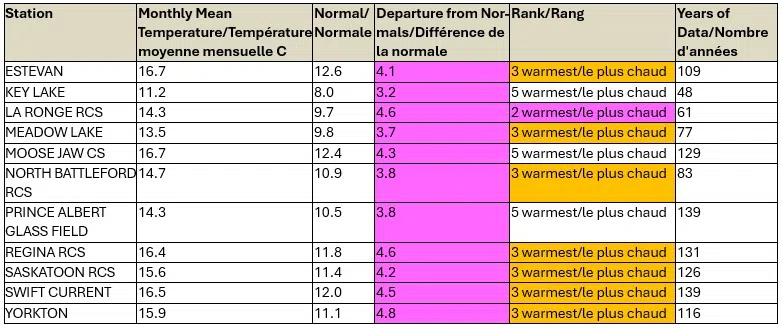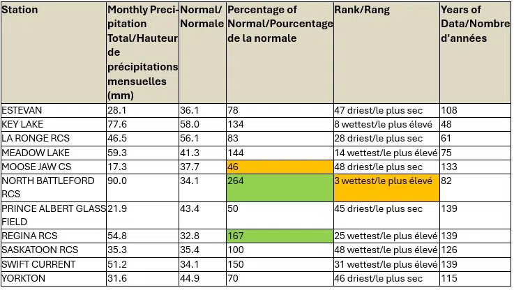 North Battleford had 90 mm and Regina 54.8 mm, both well above their yearly averages. Key Lake, Meadow Lake, and Swift Current also had more rain than normal last month.