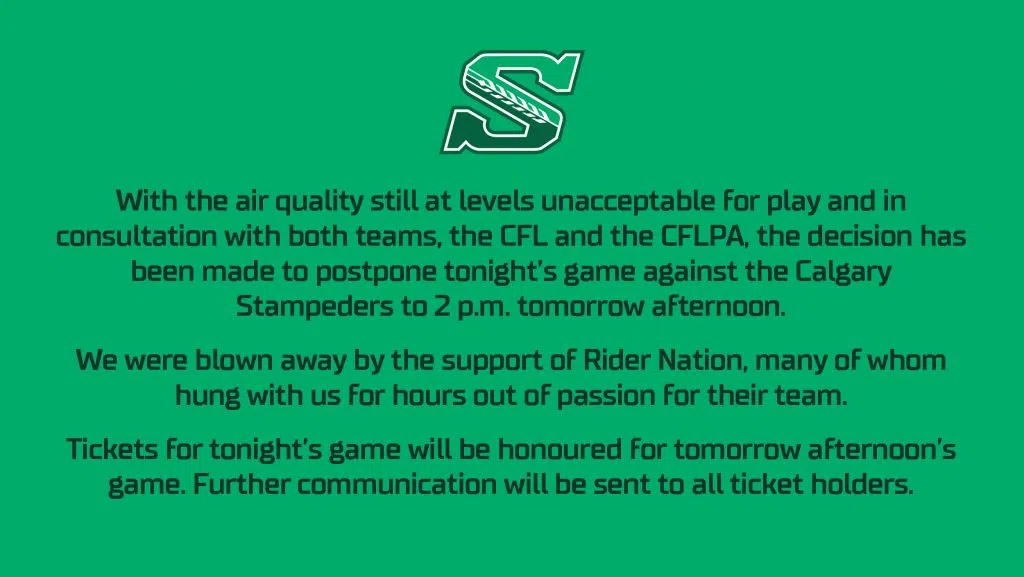 The concern from the CFL and the Roughriders is for player safety. In the air quality advisory, Environment Canada suggests people curtail any rigorous outdoor activities, like sports, because of the fine particles in the smoke.