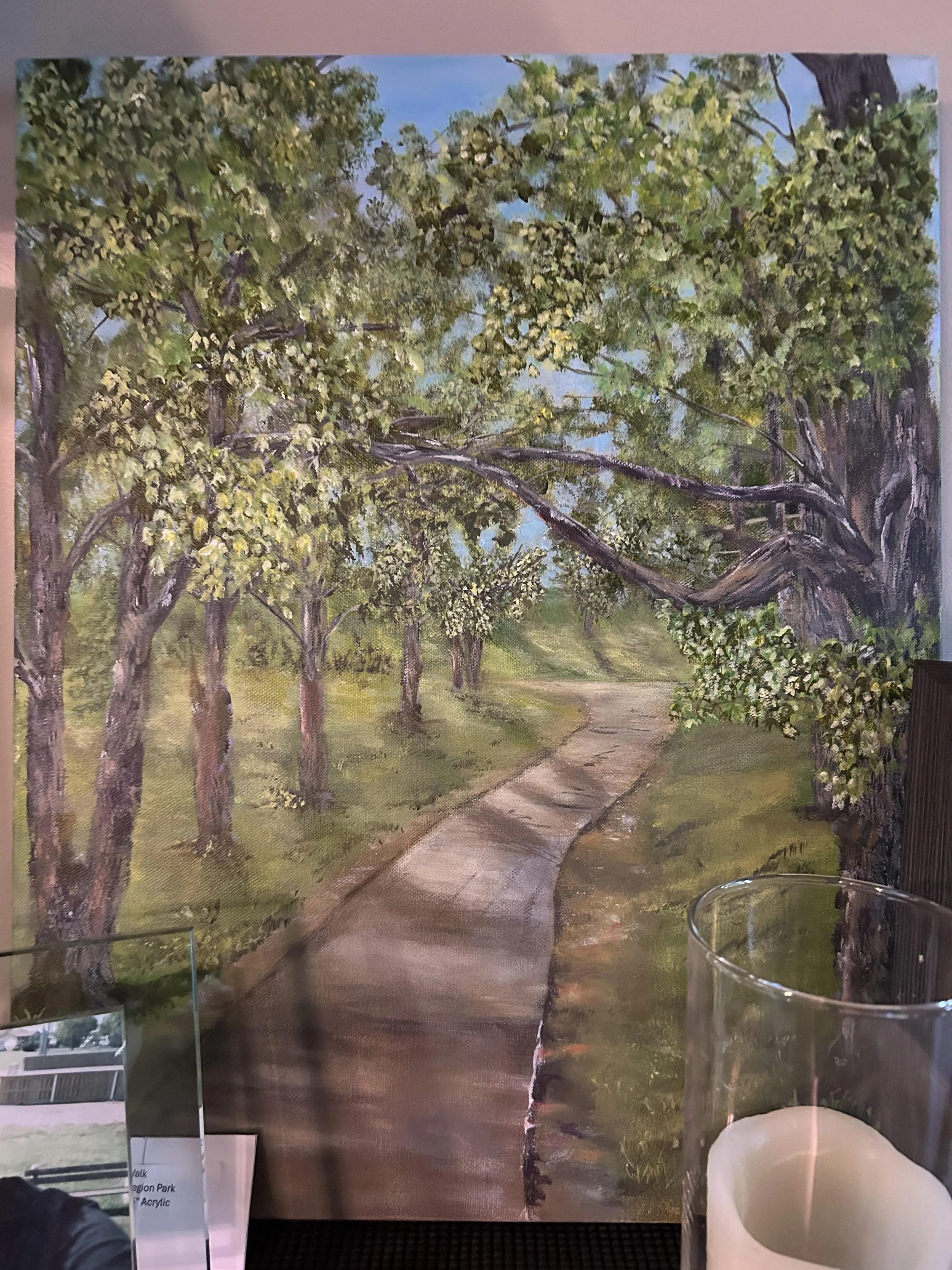 While I was there, another one of her landscapes caught my attention. A simple path shaded by beautiful lush trees hanging overhead. It captured the scene of a place I would love to go walking in that very moment. I had to have it, so I brought it home with me. Art really does have a special way of connecting us—to a place, a moment, and even to each other.