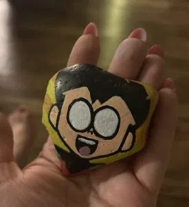 And forget flowers and smiley faces. Lately, my masterpieces feature the likes of Stitch and Leroy (because who doesn’t want a little alien chaos on their coffee table?), the infamous Chicken Jockey from Minecraft (yes, that’s a skeleton riding a chicken—try explaining that to your grandma), and the entire Teen Titans squad. Because if you’re going to paint, go big or go home, right? Let’s not forget Grizzy and the Lemmings. Ever tried squeezing a dozen hyperactive blue lemmings onto a pebble? It’s basically a test of artistic skill and patience (emphasis on the patience).