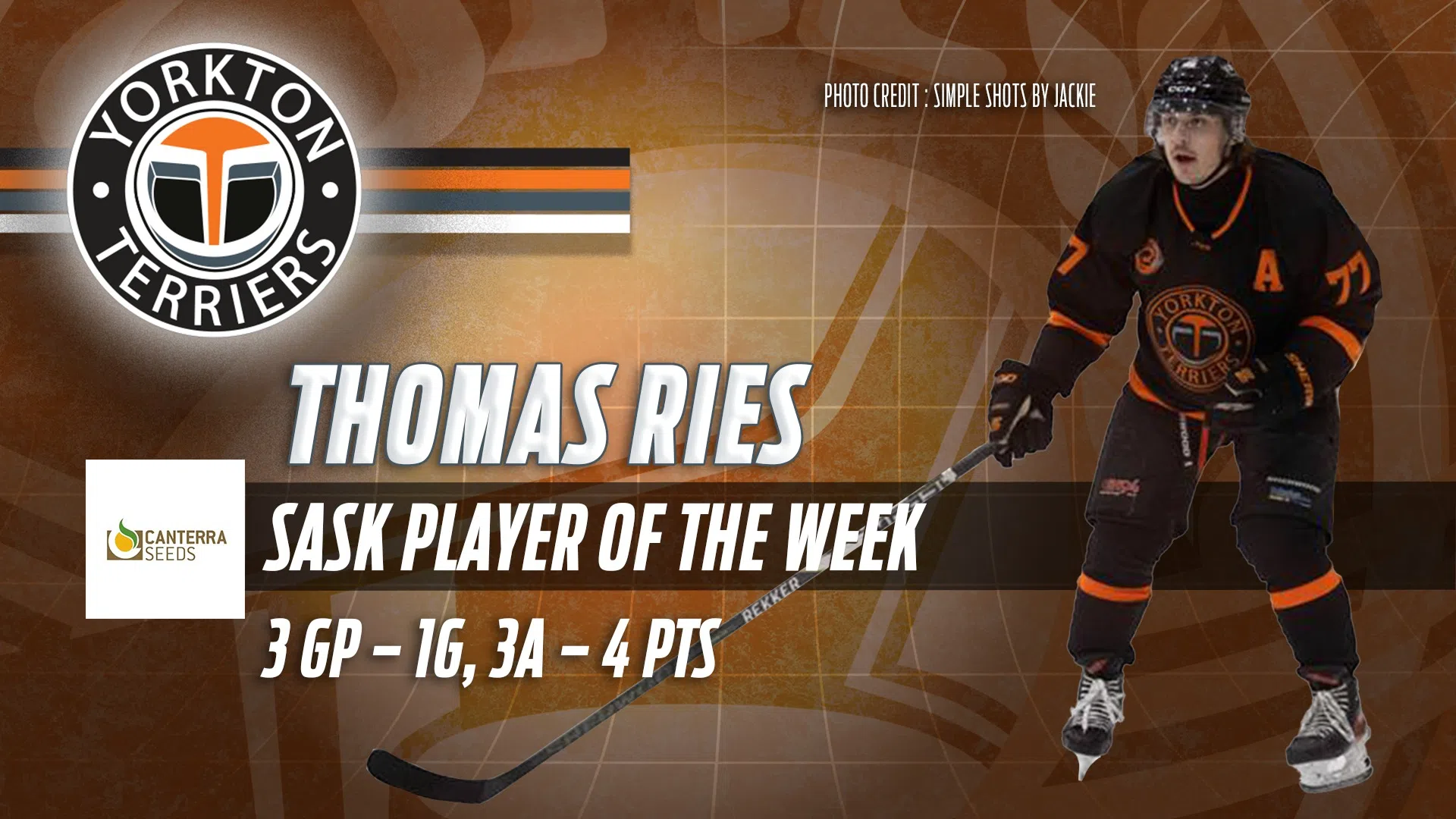 Yorkton Terriers’ Thomas Ries earns weekly SJHL recognition