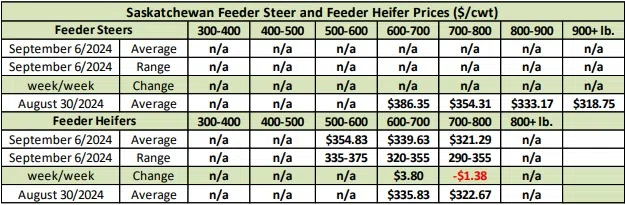 The Cattle Market Update from Canfax shows available prices for feeder heifers in Saskatchewan were mostly up while two feeder steer weight categories had enough data to record a price, but not enough...